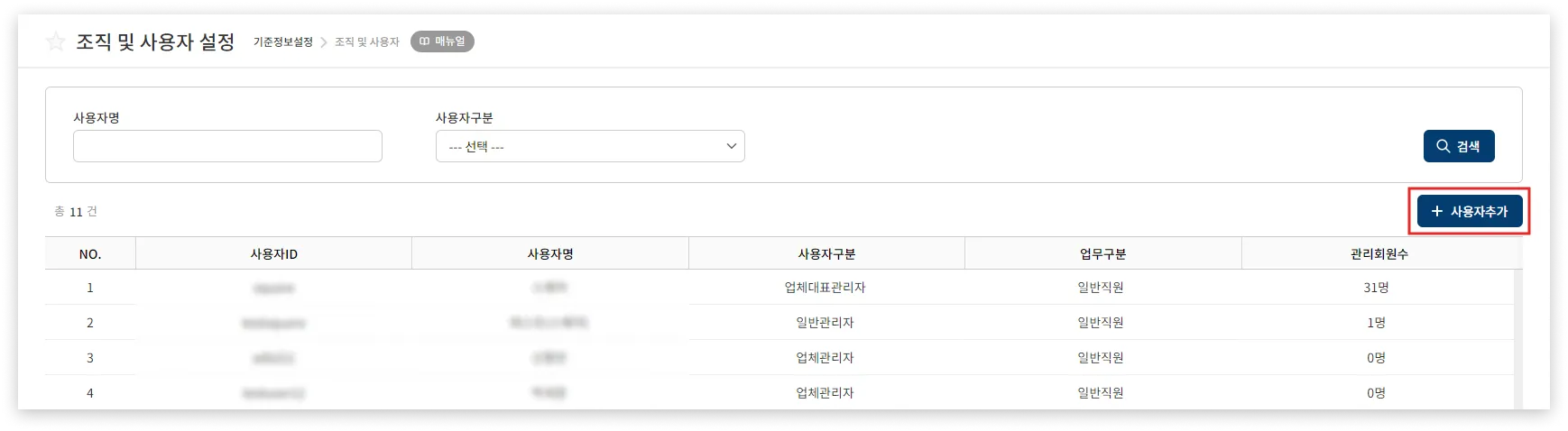 마스터(업체관리자) 아이디로 로그인 시에만 나타나는 메뉴입니다. 해당 화면에서 사용자 계정을 추가하고 권한을 부여할 수 있습니다.