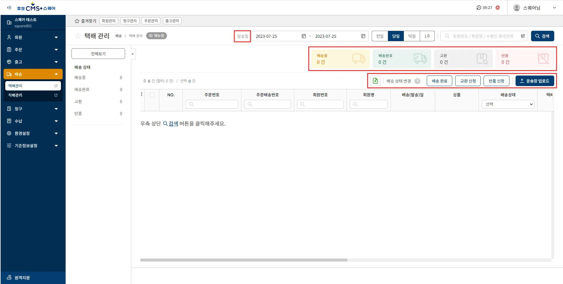 택배 관리는 택배로 배송하는 건들을 확인하고 운송장 정보를 업로드해 관리하는 메뉴입니다.