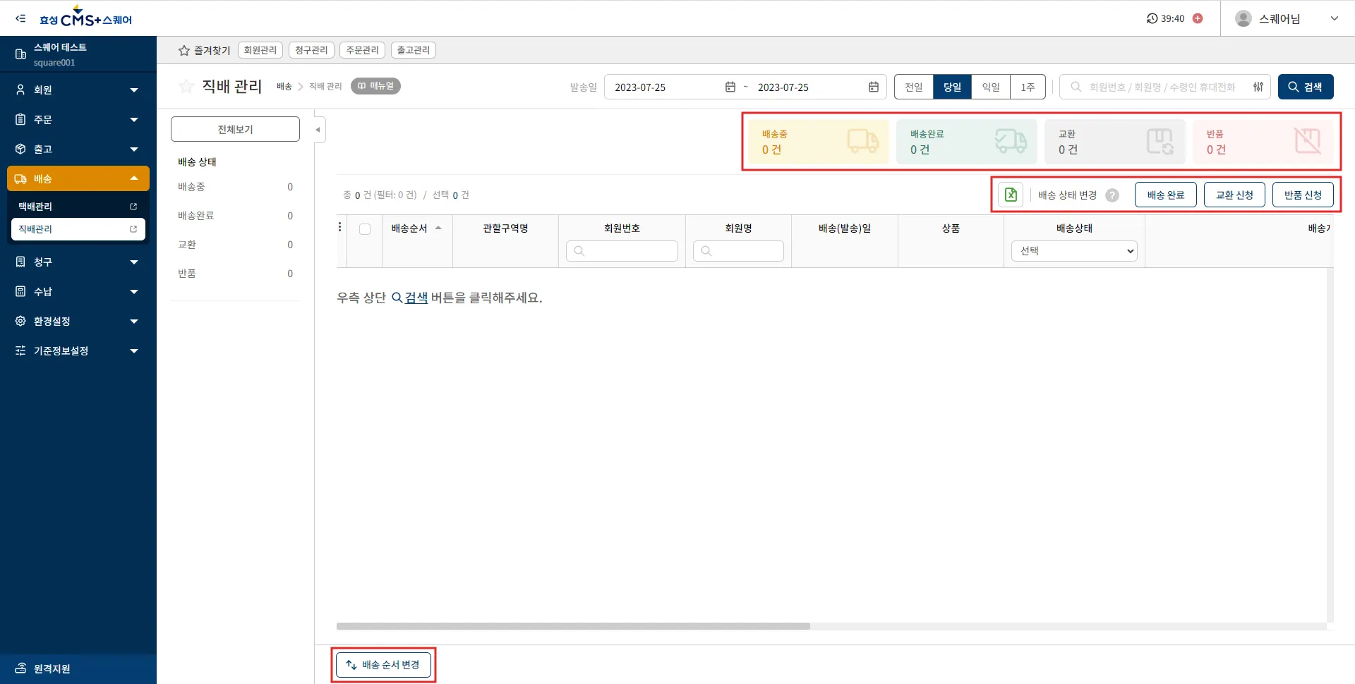 직배 관리는 직배로 배송하는 건들을 확인하고 배송 순서를 변경해 배송 목록을 관리하는 메뉴입니다. 직배는 배송일을 표시합니다.