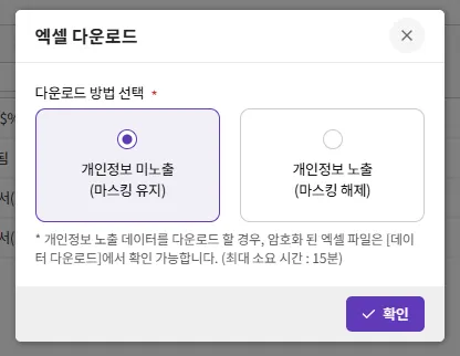 ※ 그리드 설정에서 등록번호가 선택되어 있는 경우에만 엑셀 다운로드 시 개인정보 노출 여부 선택 팝업이 나타남에 유의해주세요.