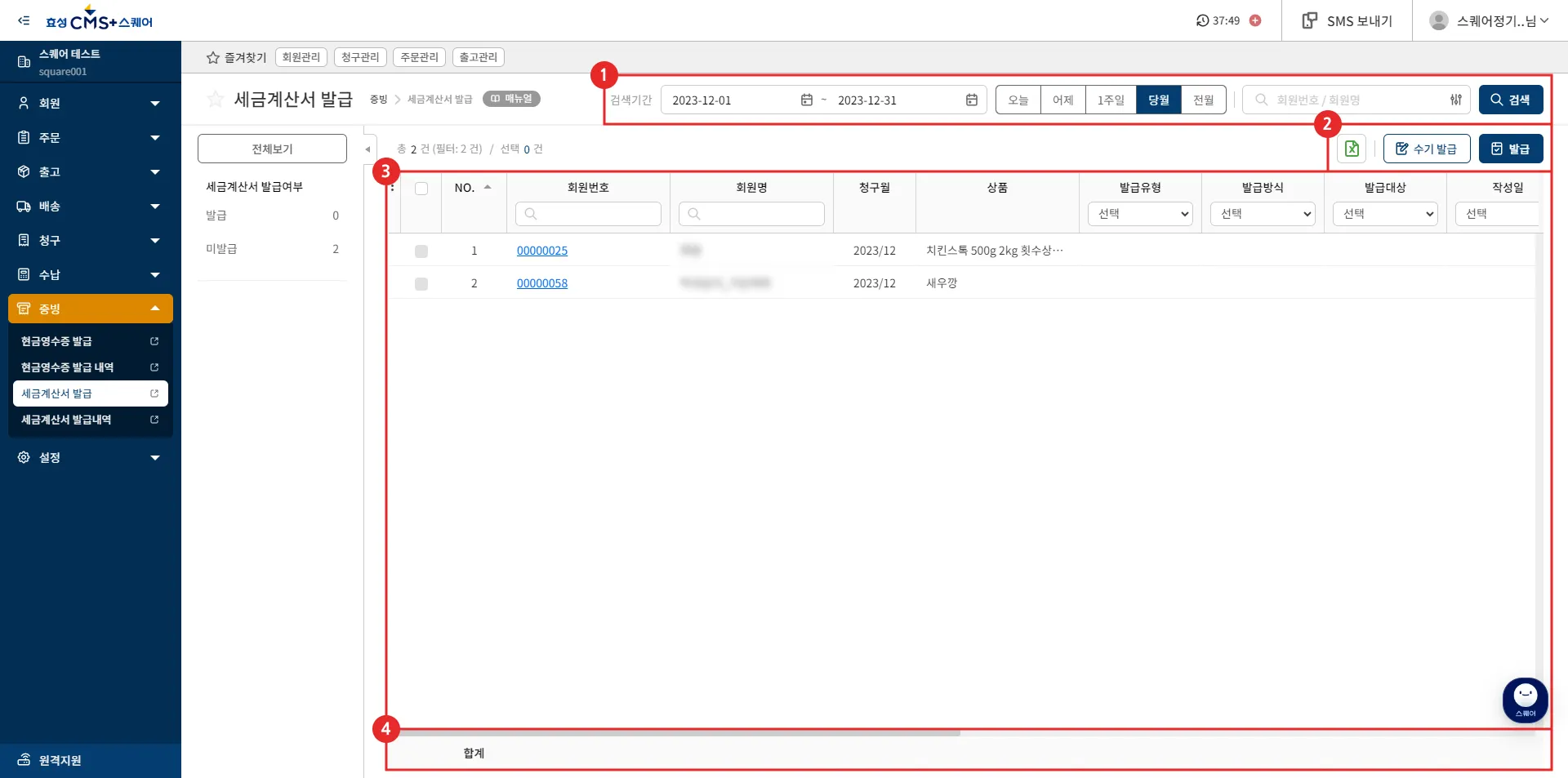 효성 CMS+ 스퀘어를 통한 수납이 아닌 수납 건에 대해 세금계산서를 발급할 수 있는 기능입니다. 다만 사전에 회원으로 등록되어있는 회원에게만 발급 가능하니 [회원 > 회원등록] 메뉴에서 회원을 미리 등록해 주세요.