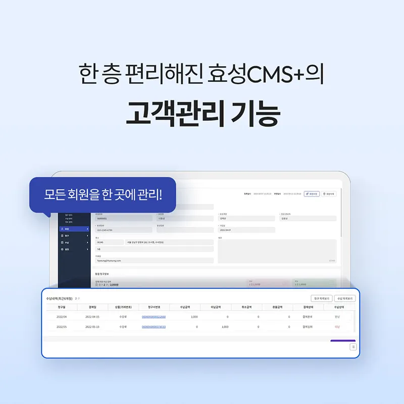 기존 효성CMS는 프로그램으로 수납받지 않는 직접결제 회원을 별도로 관리해야 했지만 효성CMS+는 이런 회원까지도 프로그램 내 등록하여 통합 관리가 가능합니다.
