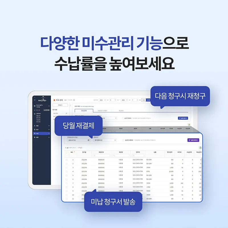 미납 청구 건을 확인하고 재결제, 재청구/합산청구, 미납 종료 및 납부자결제로 결제수단 변경까지. 내 비즈니스에 맞는, 회원별 미수처리 방법을 사용하여 수납률을 향상시킬 수 있습니다. 미수처리는 [수납 > 미수관리]에서 가능합니다.