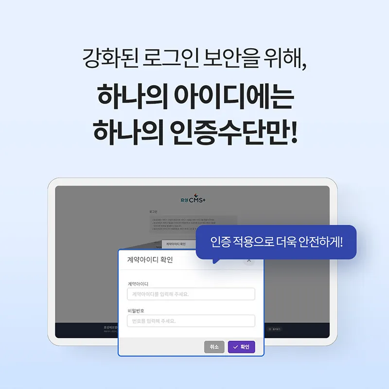 여러 명의 사용자가 아이디를 공유하던 기존 프로그램과 달리 효성CMS+는 사용자 별 다른 아이디를 사용하도록 보안이 강화되었습니다. 아이디 당 한 개의 인증수단(이메일 또는 휴대전화)만 등록할 수 있으며 관리자 계정인 마스터 아이디는 각 사용자 별 메뉴 사용 권한을 제한할 수 있습니다. 사용자 별 인증 및 업무범위에 맞는 권한 설정으로 강화된 효성CMS+의 보안 기능, 이제 안심하고 금융 서비스를 누려 주세요!