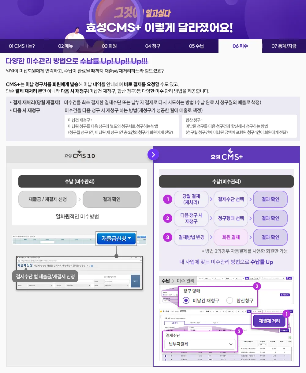 골치 아픈 미수처리, 효성CMS+의 다양한 미수처리 방법을 활용해 보세요.