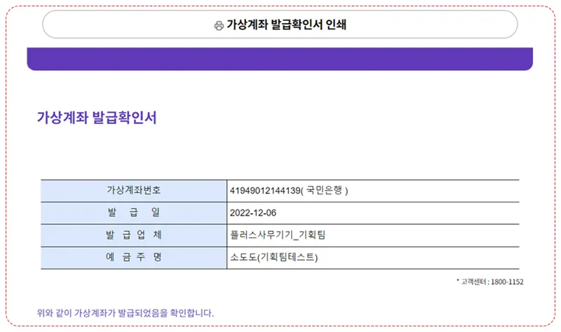 증빙을 위한 발급확인서를 인쇄할 수 있습니다. 가상계좌 발급확인서는 다음과 같습니다.