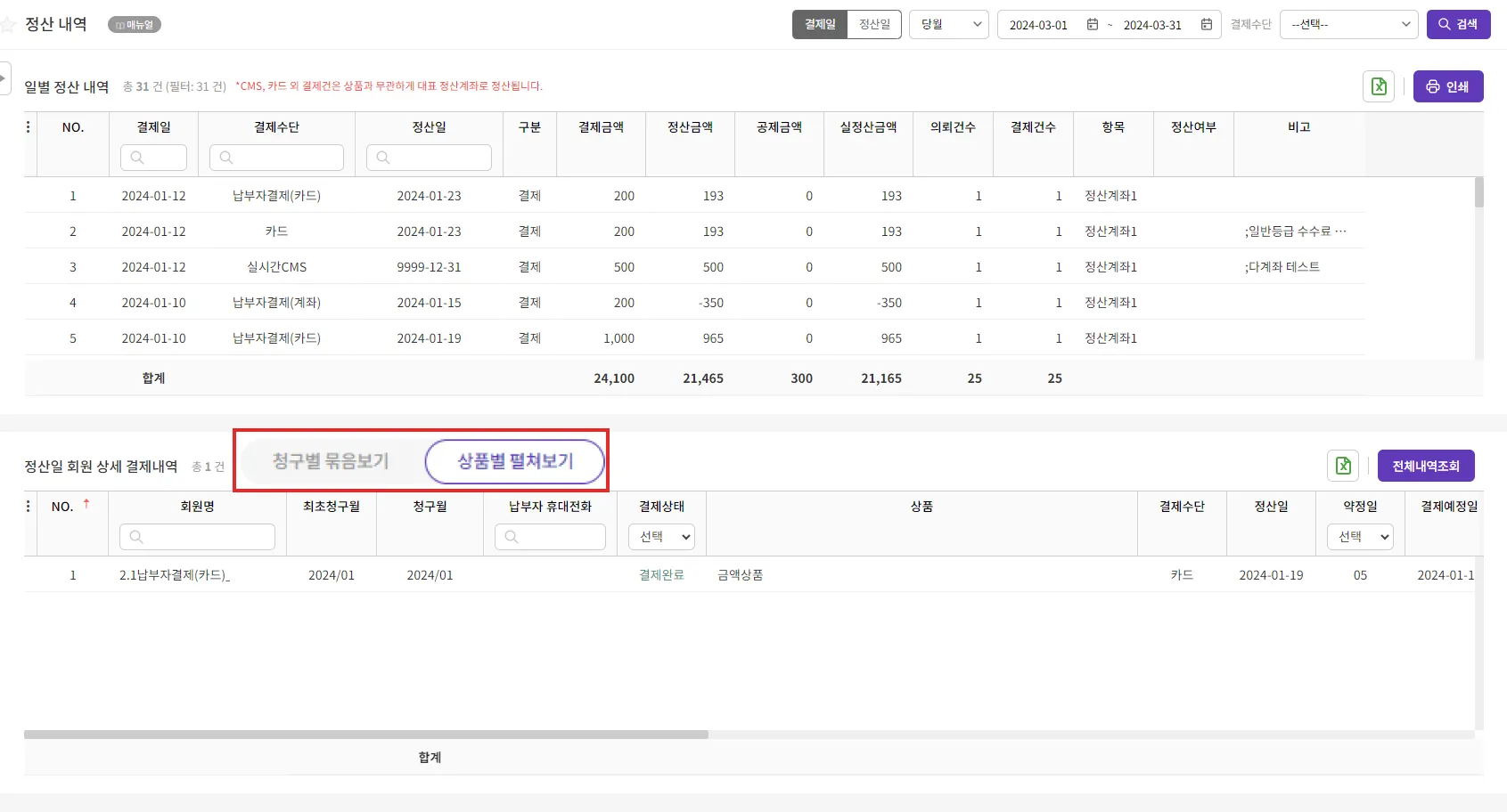 검색을 통해 조회할 내역의 조건을 설정합니다. 검색을 통해 정산일 또는 결제일 기준으로 검색할 수 있으며, 특정 결제수단만을 분류하여 확인할 수 있습니다.