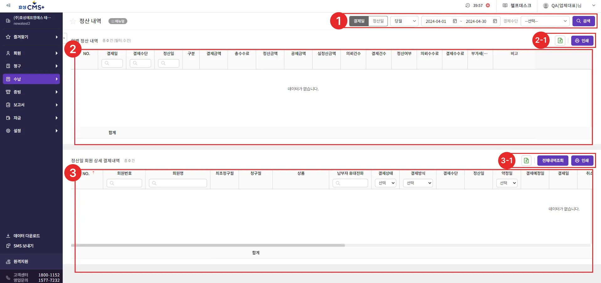 [수납 > 정산내역]에서 정산내역을 확인하고 해당 일자의 상세결제내역을 조회할 수 있습니다.