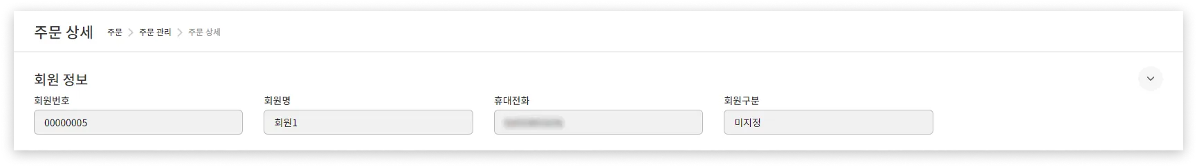 주문한 회원의 정보(회원번호, 회원명, 휴대전화, 회원구분)를 간략히 보여줍니다. 회원정보를 통해 해당 주문이 어떤 회원의 주문인지 확인할 수 있습니다.