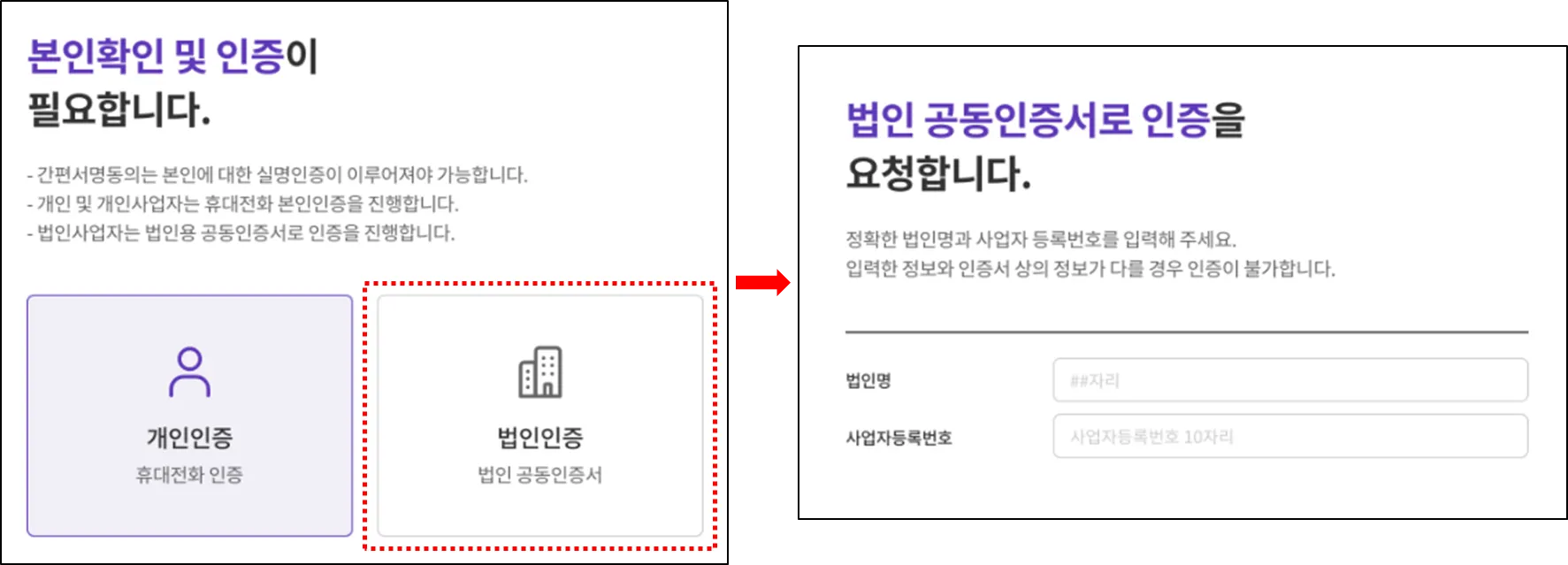 3. * 약관 동의 및 인증 - 개인/개인사업자 : PASS/문자 - 법인사업자 : 법인 공동인증서
