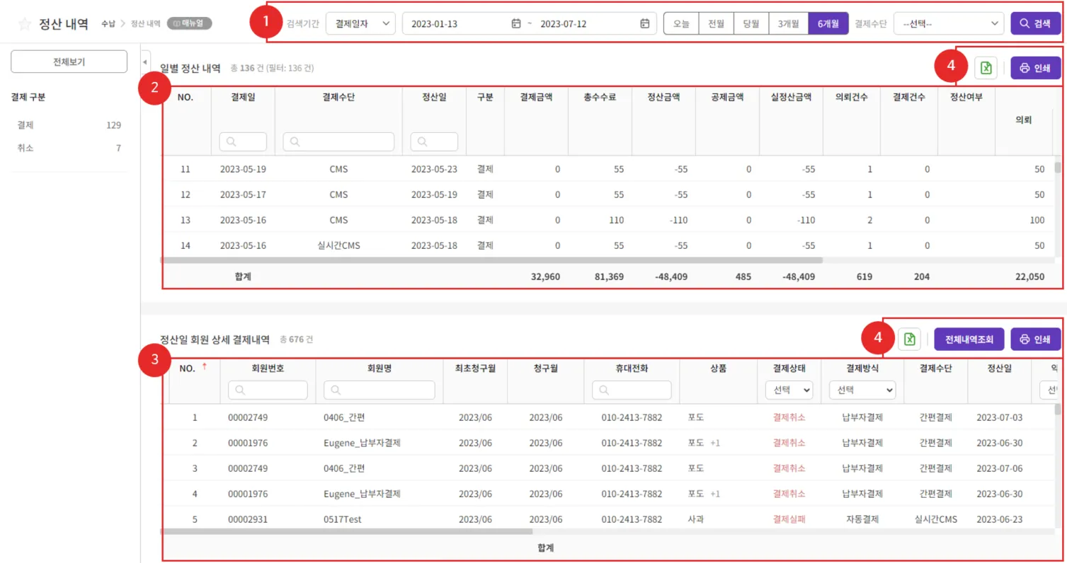 4. 엑셀 다운로드를 통해 정산 내역을 다운받거나 인쇄를 통해 내역을 출력할 수 있습니다. [전체내역조회] 버튼을 클릭하여 상단 일별 정산 내역의 회원별 상세 결제내역 전체를 확인할 수 있습니다.