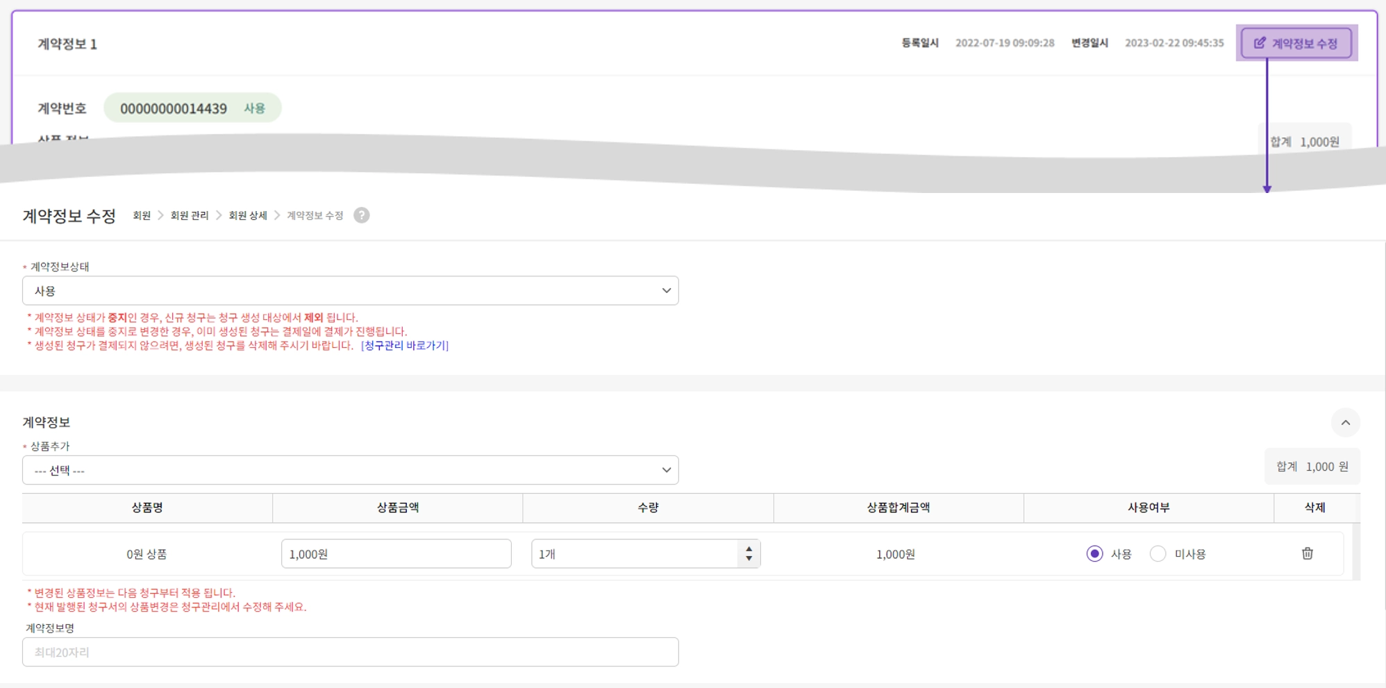 계약정보 수정은 등록된 회원의 계약정보 상태, 계약정보, 결제정보, 청구정보, 부가정보에 대해 수정할 수 있습니다.