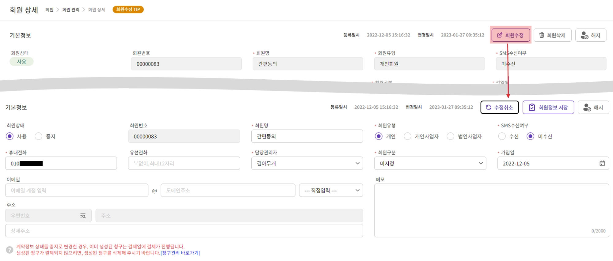 회원 기본정보/계약정보 수정