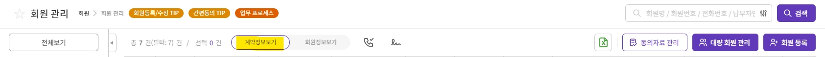- [계약정보보기] 페이지에서 보이는 내역의 개수와 [회원정보보기] 페이지에서 보이는 내역의 개수는 상이할 수 있습니다.