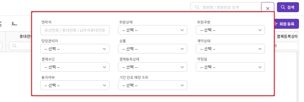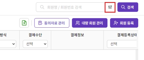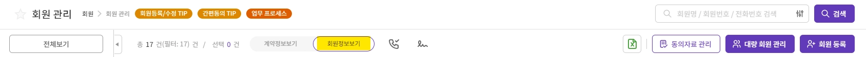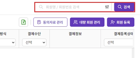 - 회원명, 회원번호를 입력하여 통합 검색이 가능합니다.