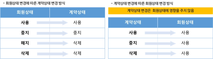 회원 상태에 따라 회원 정보를 확인할 수 있는 페이지가 다르며, 회원 상태가 바뀌면 회원 하위의 계약 정보 역시 함께 변경됩니다.