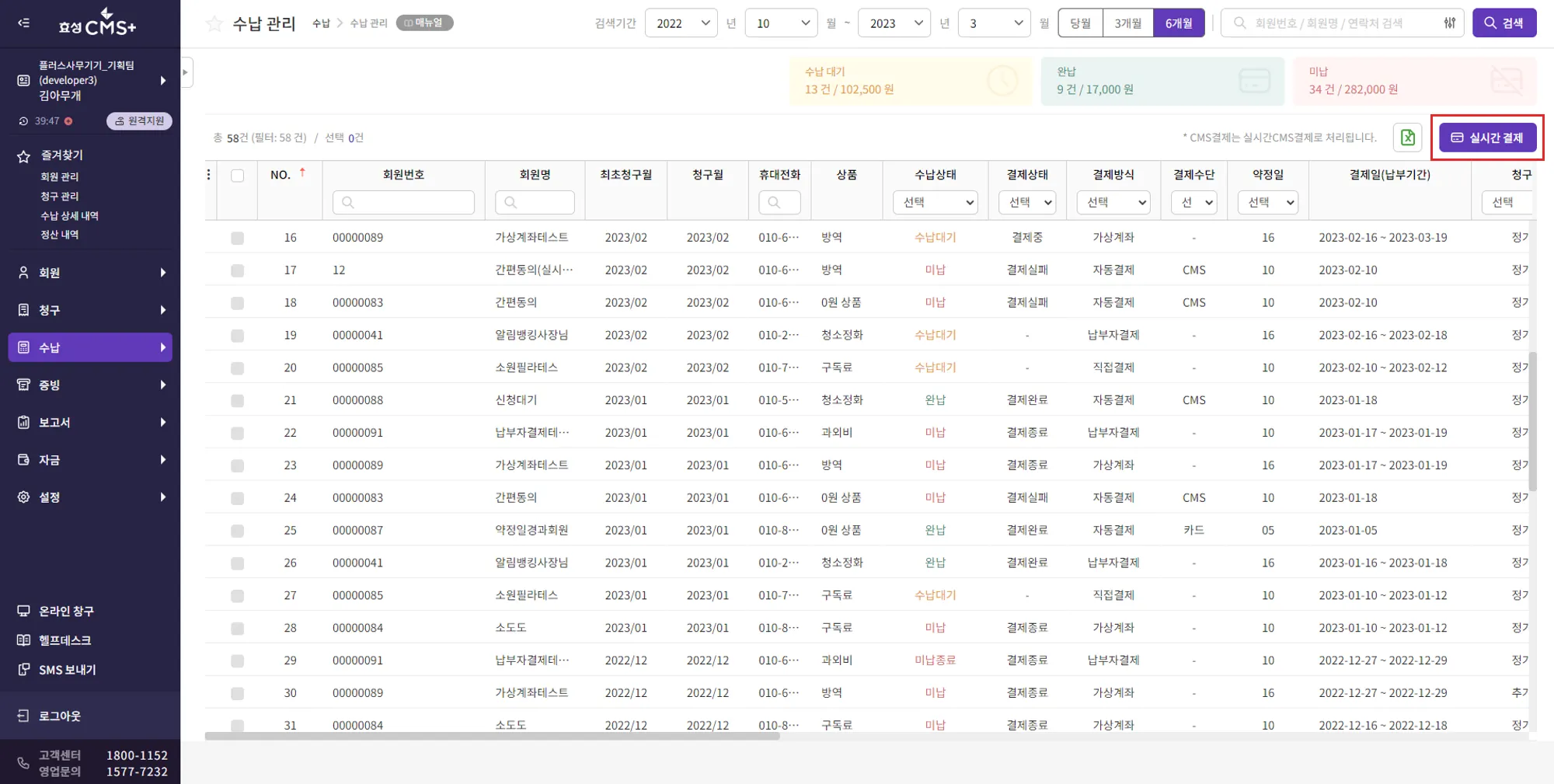 상단 검색기간(청구월 기준)을 설정하여 해당 검색기간 동안 생성/신청한 결제 건의 수납 현황을 확인합니다. [실시간 결제] 버튼을 통해 결제일이 도래하지 않은 실시간CMS, 카드, 휴대전화 청구건을 즉시 결제 할 수 있습니다.