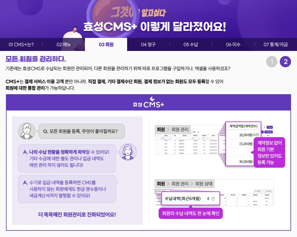 기존 효성CMS는 프로그램으로 수납받지 않는 직접결제 회원을 별도로 관리해야 했지만 효성CMS+는 이런 회원까지도 프로그램 내 등록하여 통합 관리가 가능합니다.