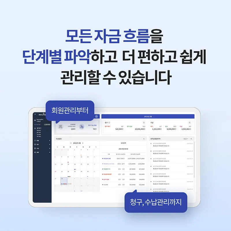 결제수단별 회원을 등록하고 결제 신청 후 내역을 확인하는 단순한 수납 관리 서비스에서 탈피하여 효성CMS+는 회원, 청구, 수납, 자금의 비즈니스 흐름에 맞춰 메뉴를 구성하였습니다.