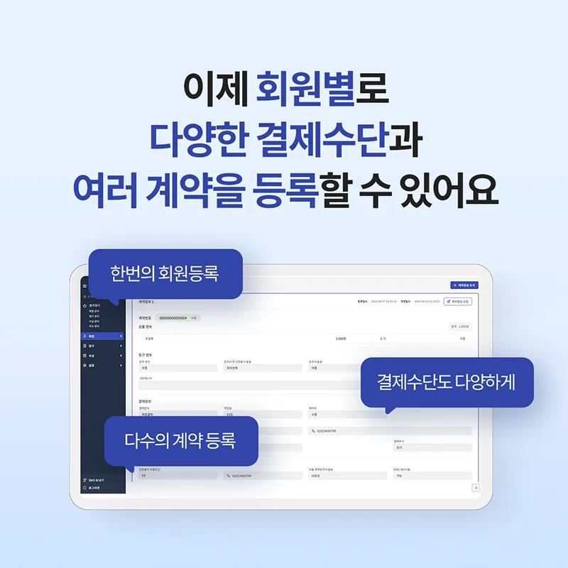 효성CMS+는 계약 단위로 회원을 관리하여 1 회원 하위에 다수의 계약과 결제수단 등록이 가능합니다.
