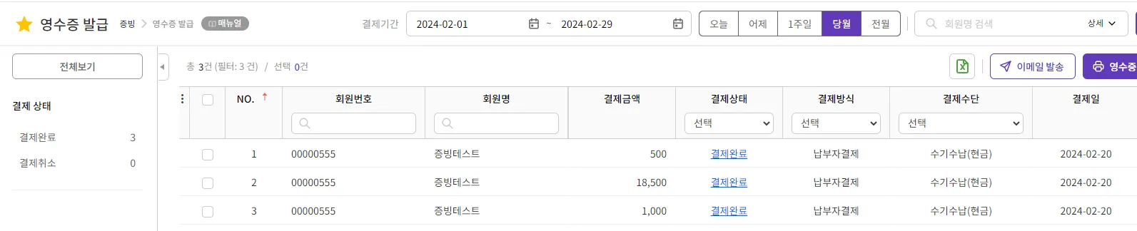 예) 계약 금액이 20,000원 이고 1) 1,000원, 2)500원, 3)18,500원 으로 세 번에 걸쳐 수기수납을 완납하였다면 아래 이미지와 같이 각각에 대해 영수증이 발급됩니다.