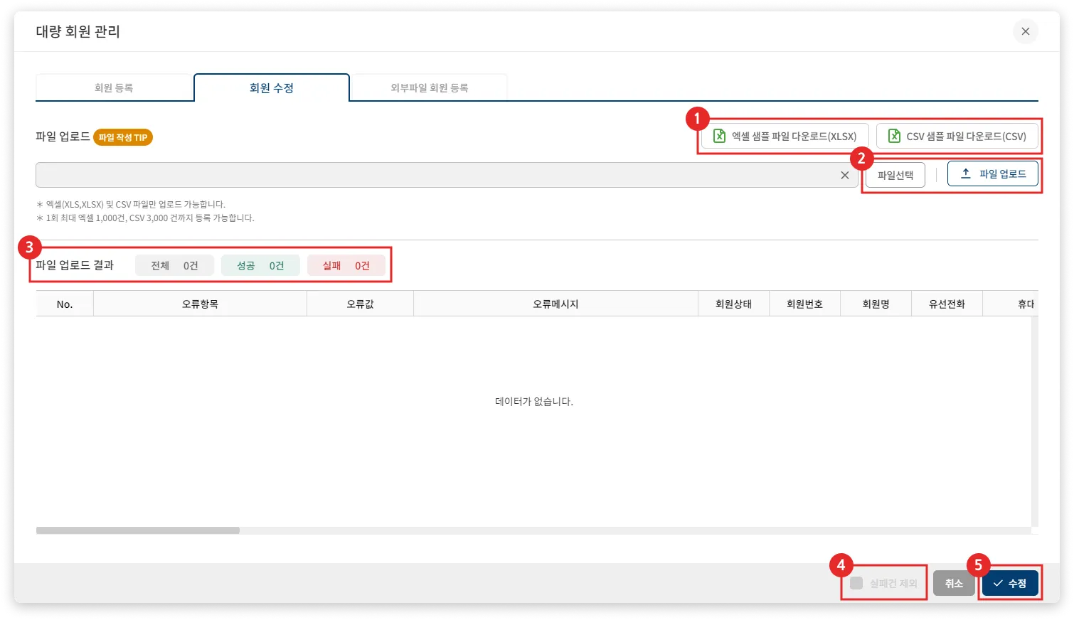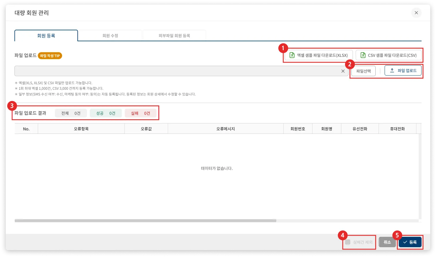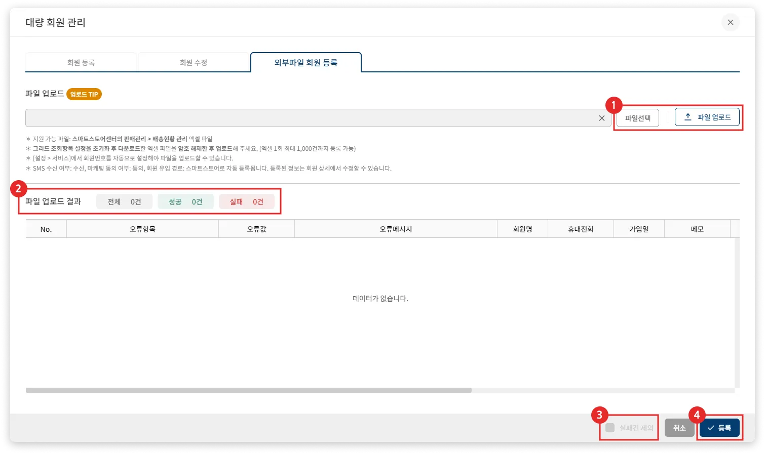 외부에서 다운로드 받은 엑셀 파일을 통해 별도의 파일 작성 및 수정 없이 회원을 자동 등록할 수 있는 기능입니다. 현재 외부 파일은 스마트스토어센터의 판매관리 > 배송현황 관리 엑셀 파일만 지원 가능합니다.