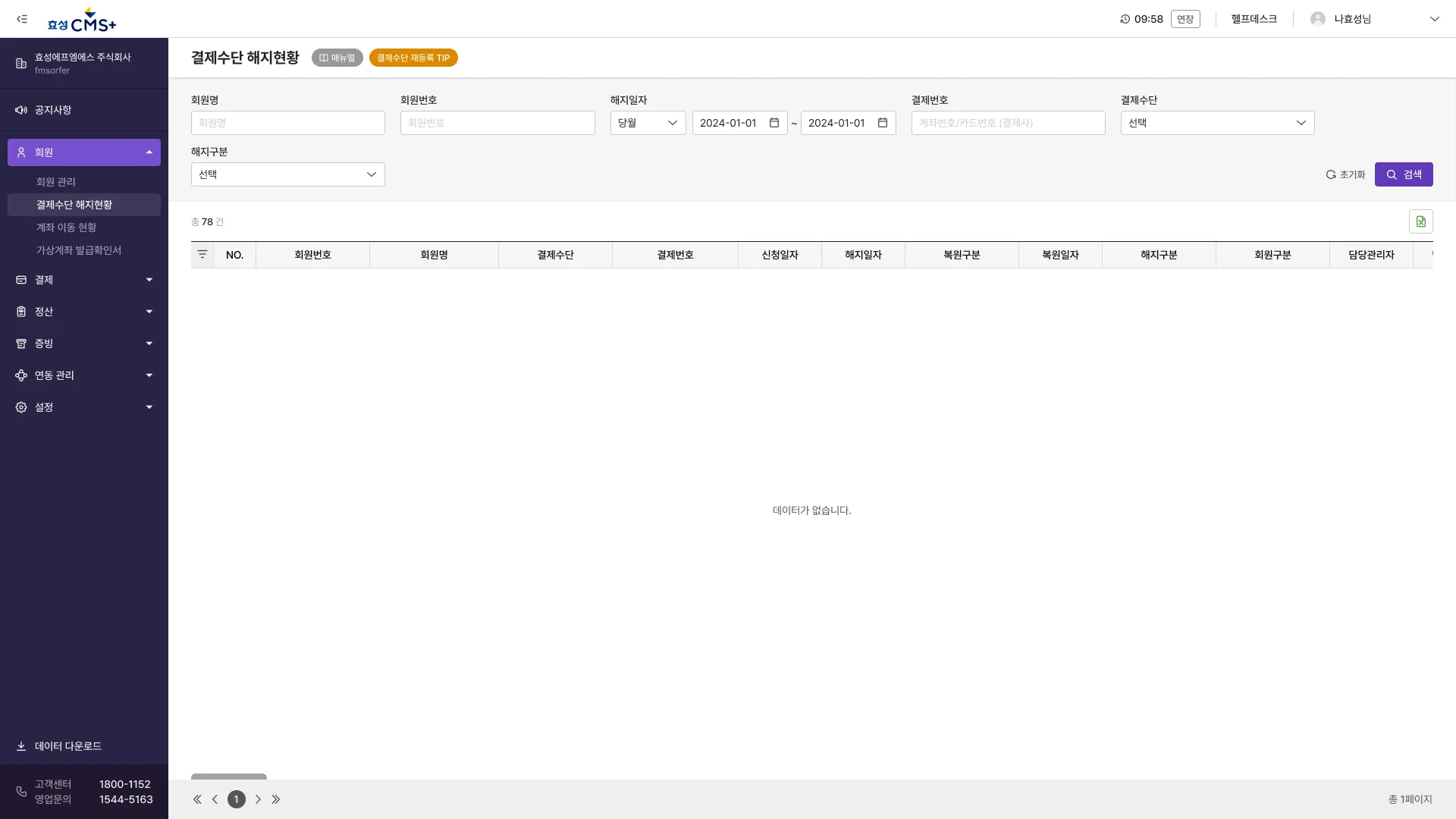 특정 조건을 선택하여 결제수단 해지 현황 내역을 검색합니다.