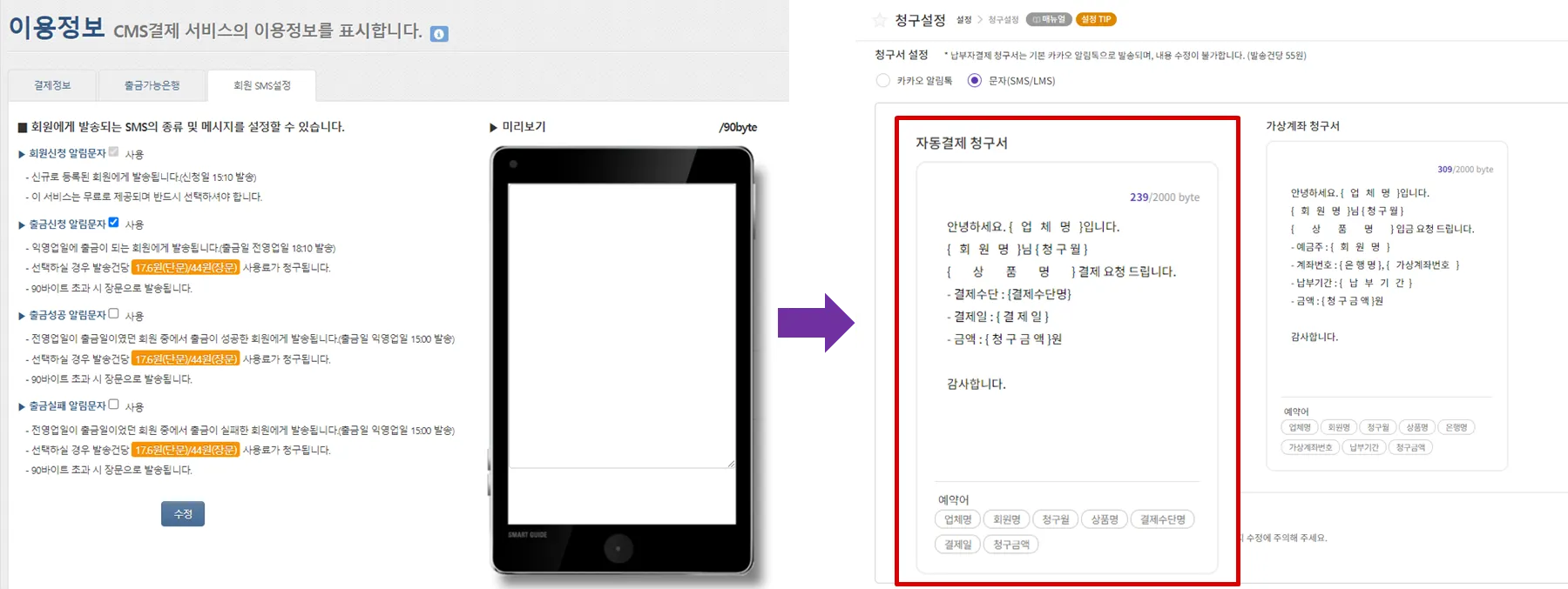 | 출금신청 알림문자 → 자동결제 청구서 발송