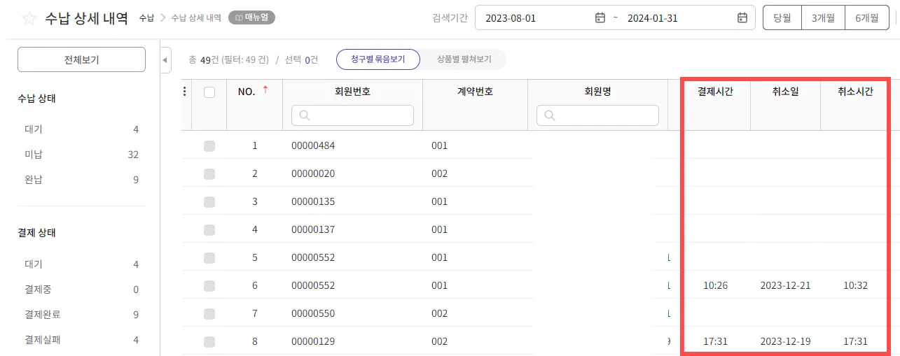 ※ 2024.01.04 이전 과거 결제 건들은 시간이 표시되지 않습니다.